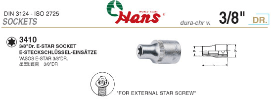 產品名稱.Product Item:3/8”DR. 星形 E 套筒/套筒起子. 3/8”DR. E-STAR SOCKETS/BIT SOCKETS-INSERTED