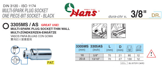 產品名稱.Product Item:火星塞套筒(卜士).SPARK PLUG SOCKETS 產品型號.Model Number:NO:3305M.3306M *規格.SIZE in mm:16mm~20.80mm 產品型號.Model Number:NO:3305A.3306A *規格.SIZE in inch:5/8"~13/16"